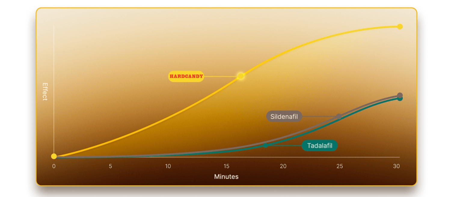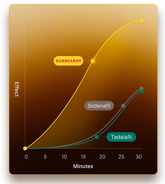 *Representing average onset time after medication dissolves, as reported by 101 Hard Candy customers in an internal survey, compared with the onset of sildenafil and tadalafil pills.
